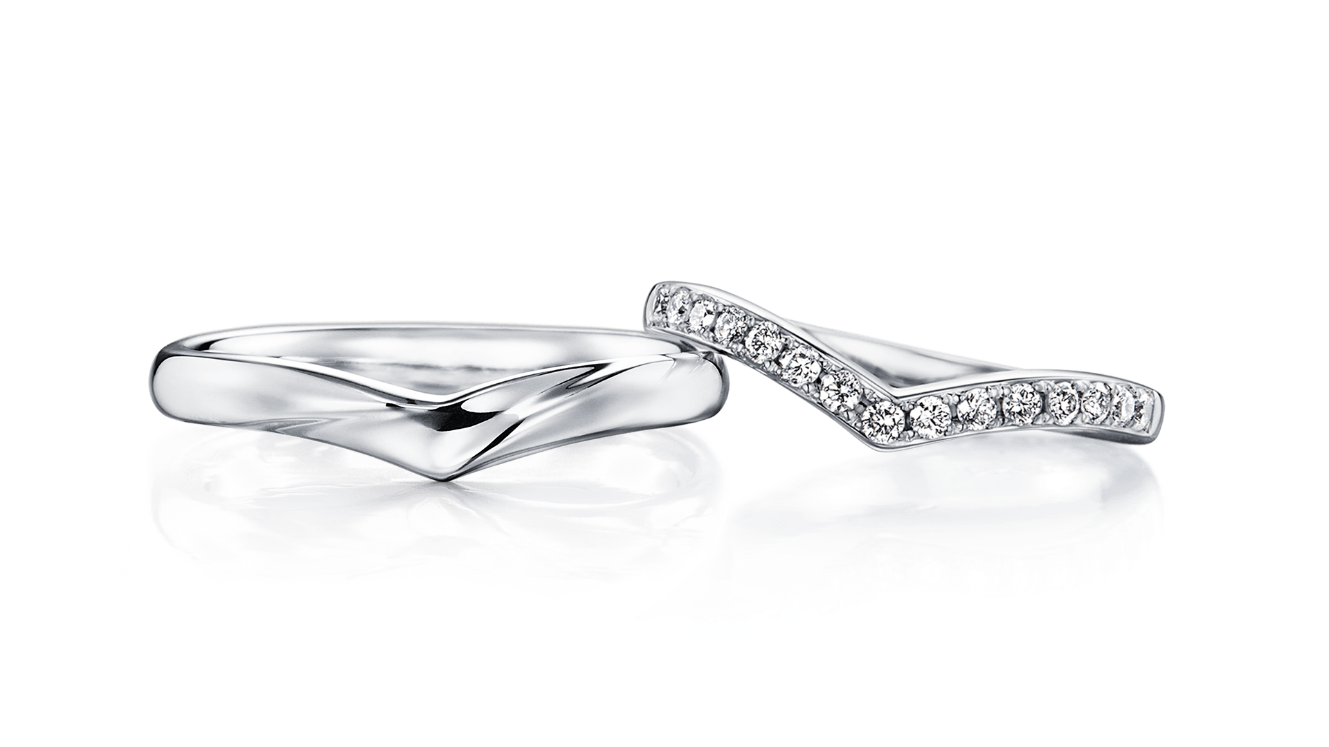 以耀眼配鑽為主角,這兩款V字型結婚戒指在舉手投足間自然展現光彩。柔和的扭曲線條延伸至戒環兩側,勾勒出優雅輪廓,既有成熟韻味,也保有細緻質感。女戒以細版V字設計貼合手指弧度,滿鑲配鑽在光線下層層閃耀,呈現華麗卻不顯厚重的氣質;疊戴時更能凸顯纖細線條,為整體造型增添層次。