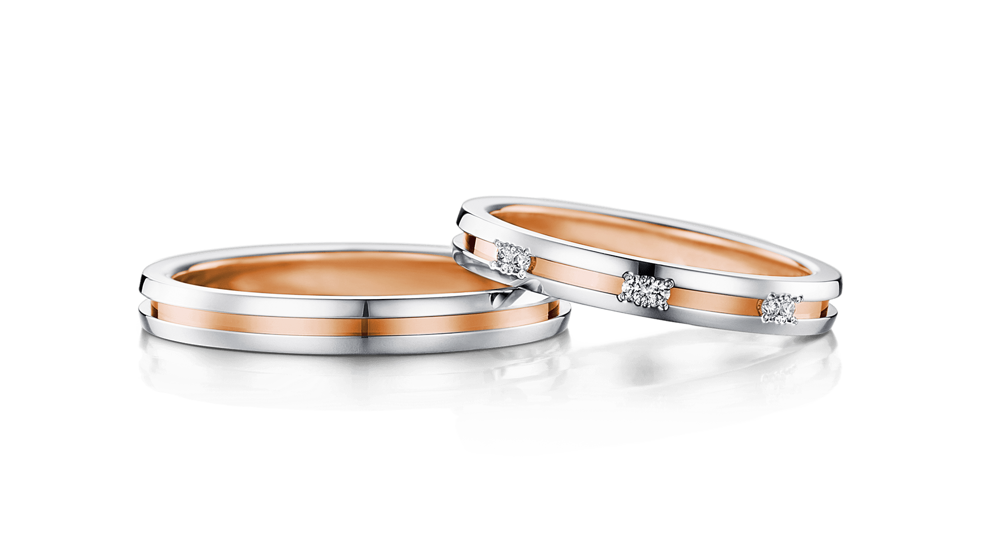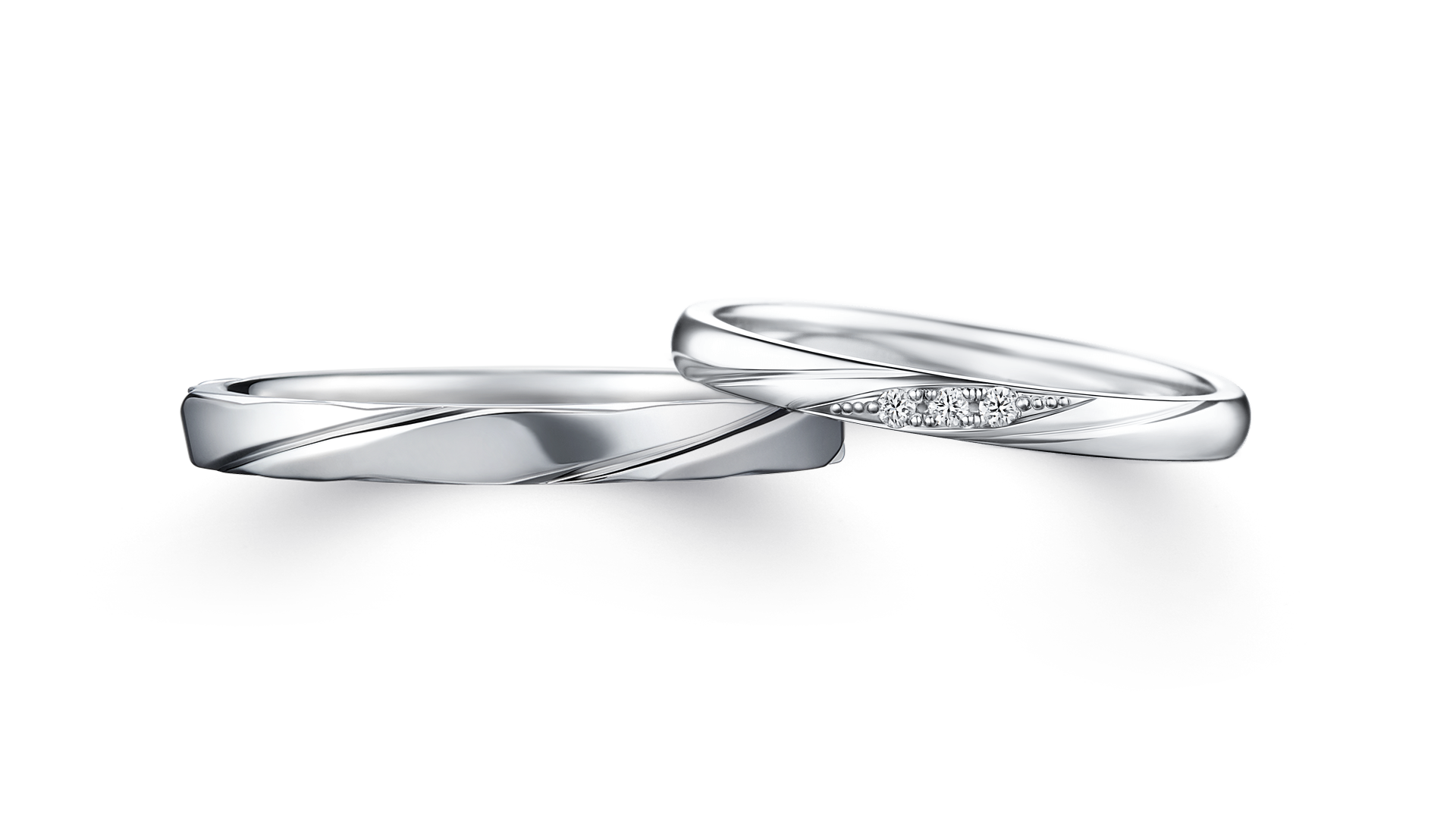 男戒以盛放櫻花為靈感,從戒環側邊可見細緻的五瓣花形輪廓。流暢而富節奏感的曲線切割,展現鍛造工藝的精準度與層次感,線條俐落卻保有溫潤氣質。女戒以兩道貫穿戒環的線條勾勒出優雅輪廓,象徵彼此相互依靠、攜手前行。弧線自然延展,呈現純粹而清新的氣質,細節之中隱含力量感,如同描繪兩人朝向未來的軌跡,靜靜見證彼此的約定。