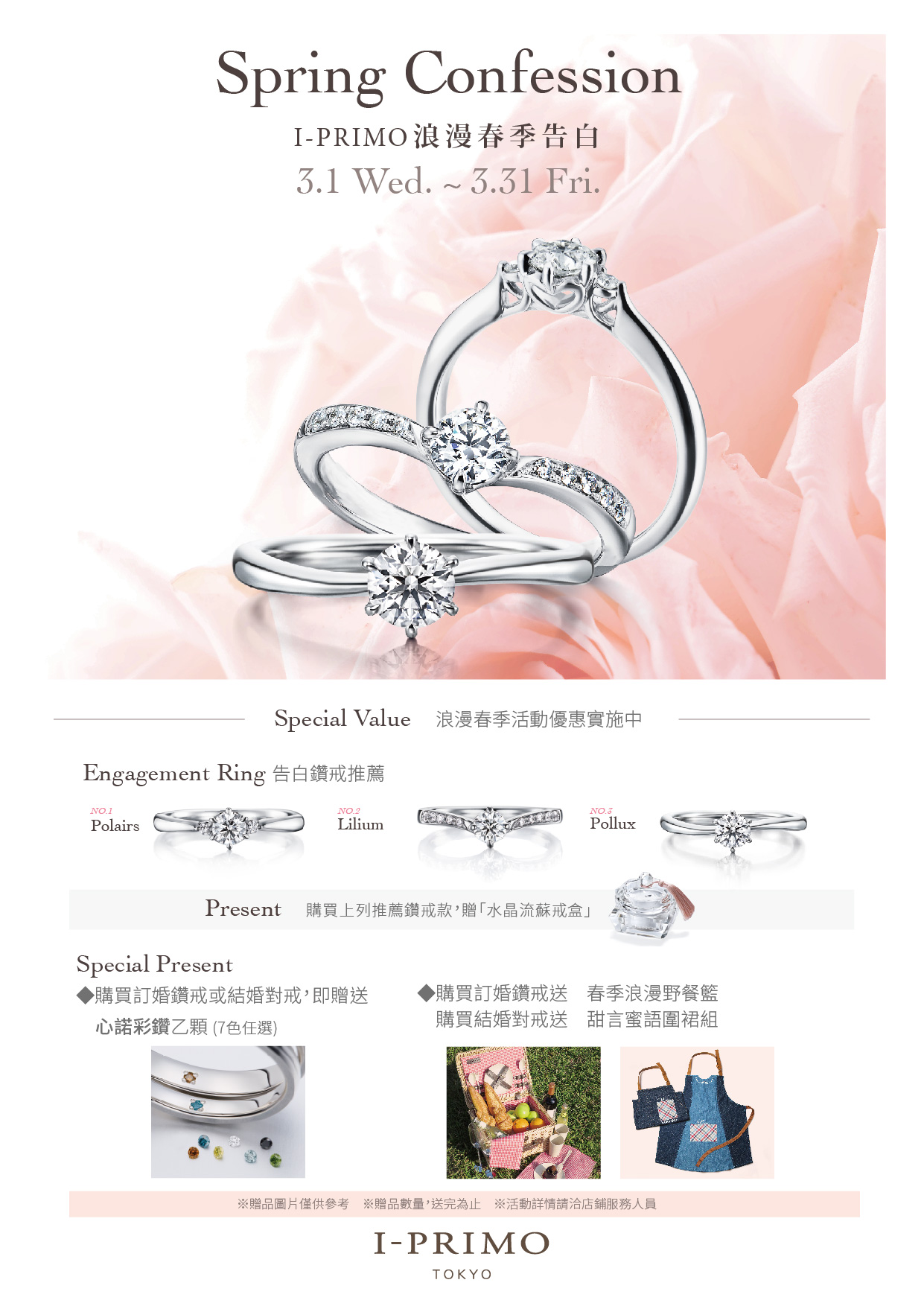 ‧ 活動期間凡購買【指定告白鑽戒(Polaris/Lilium/Pollux)】,即贈「水晶流蘇戒盒」乙個。