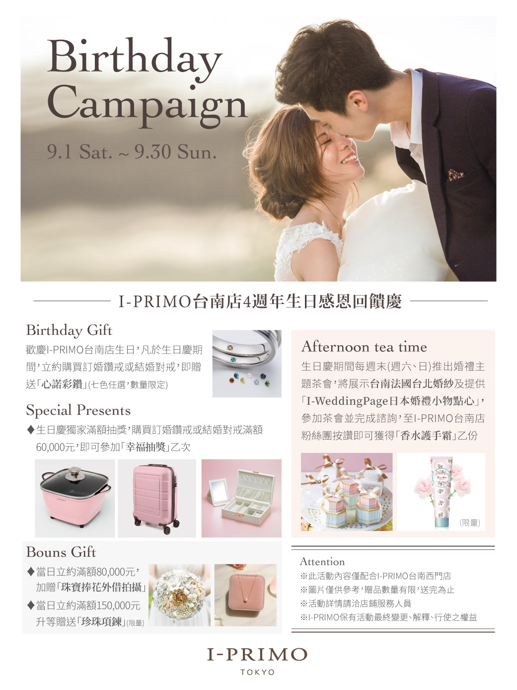 9.1 Birthday Campaign「台南店」生日感恩回饋慶!|訂婚鑽石戒指與結婚對戒首選 I-PRIMO 邂逅命運之戒的婚禮鑽石首飾專賣店