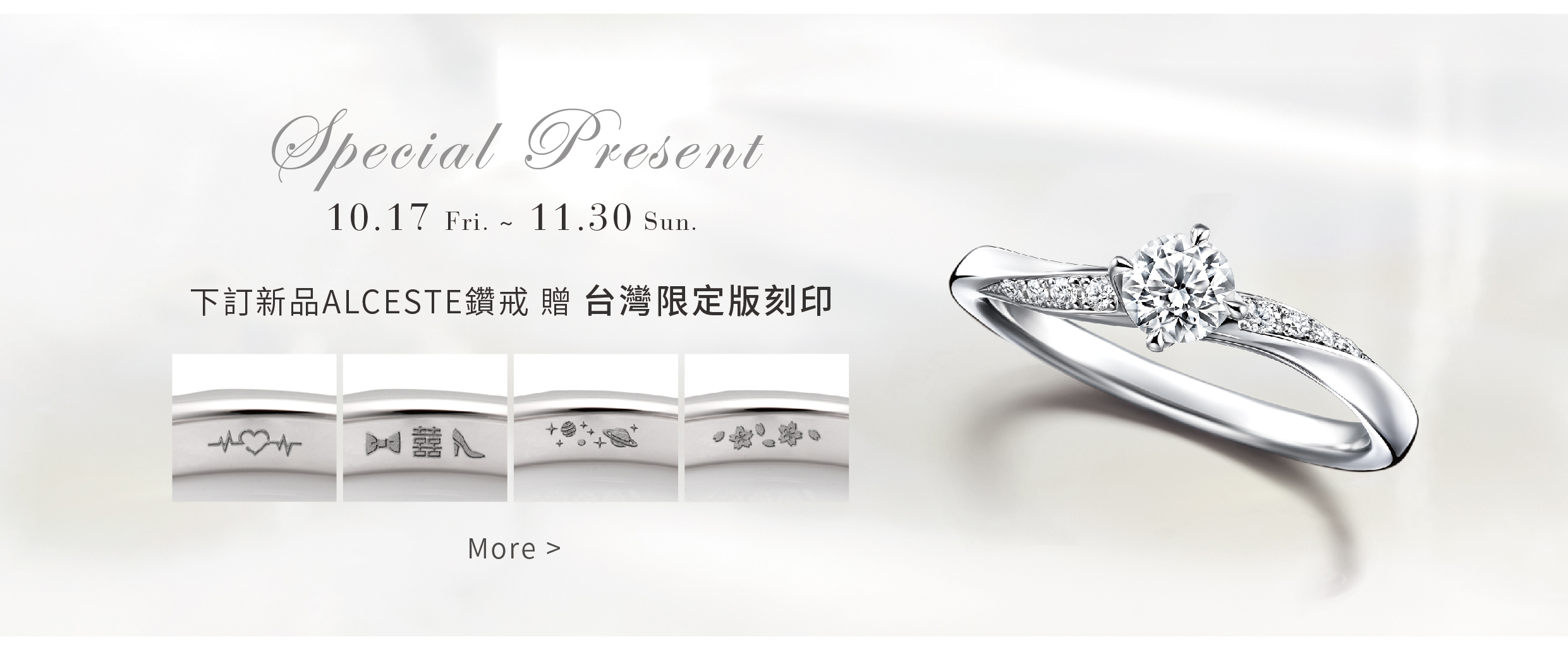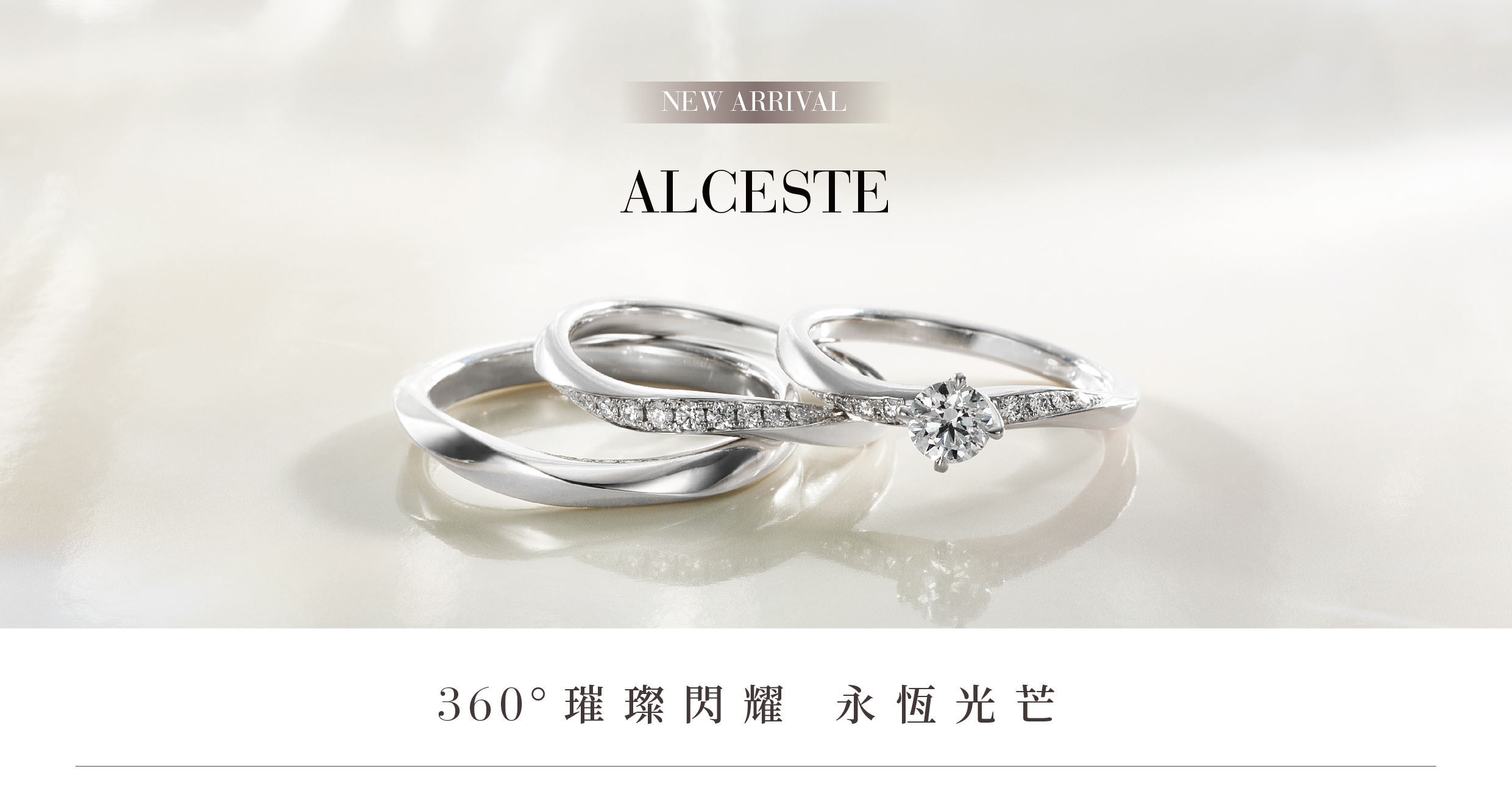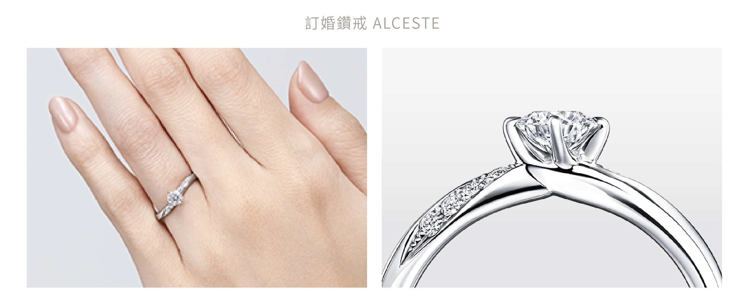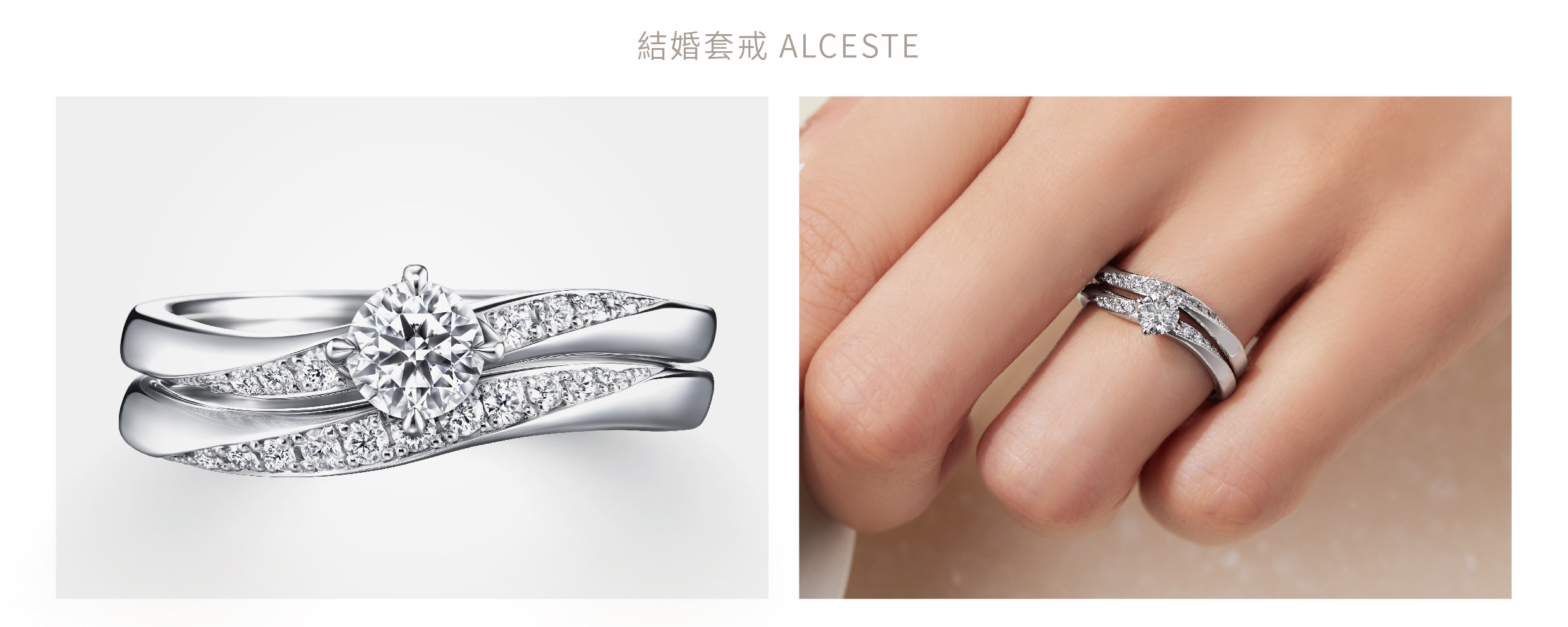 新款訂婚鑽戒 ALCESTE 為波浪線條的戒環鑲鑽款式,特色是疊戴時呈現的成套設計,以及完美貼合的線條。整體顯得既華麗又渾然一體,讓人感受到套戒獨有的搭配魅力。 不只正面,側面也講究美感的細膩 主鑽以四爪鑲嵌,由於戒爪數量少,遮蓋主鑽的原料金屬量也隨之減少戒爪更進一步刻出深深的切口,藉此襯托出鑽石的極致光芒。 溫柔依偎、親密和諧的輪廓 疊戴時自然依偎的絕妙弧線,流暢重合的閃亮線條。從配鑽大小到戒環粗細都經過精密考量,追求重疊時的完美比例。