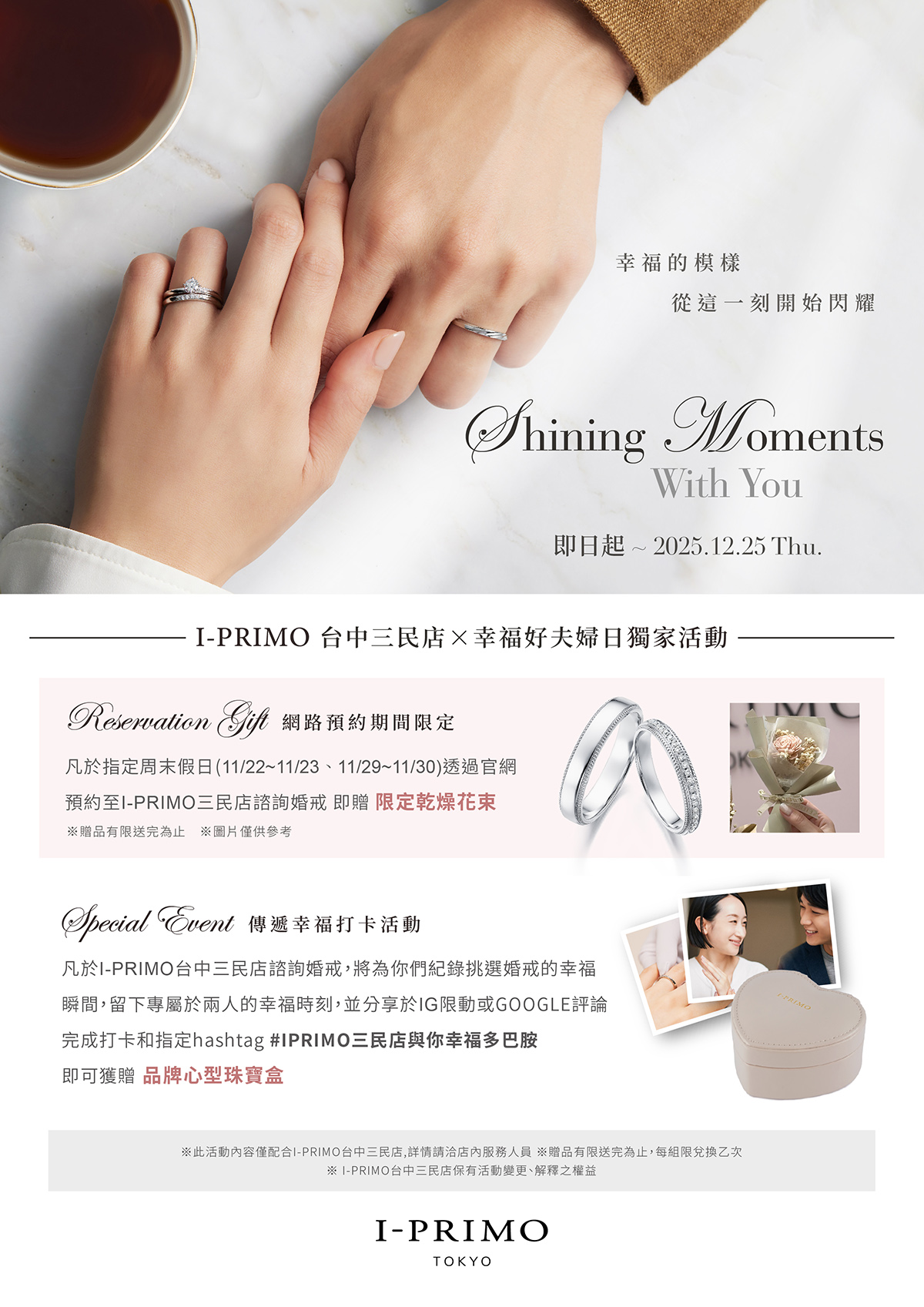 .於I-PRIMO台中三民店諮詢婚戒,將為你們紀錄挑選婚戒的幸福瞬間,留下專屬於兩人的幸福時刻,
