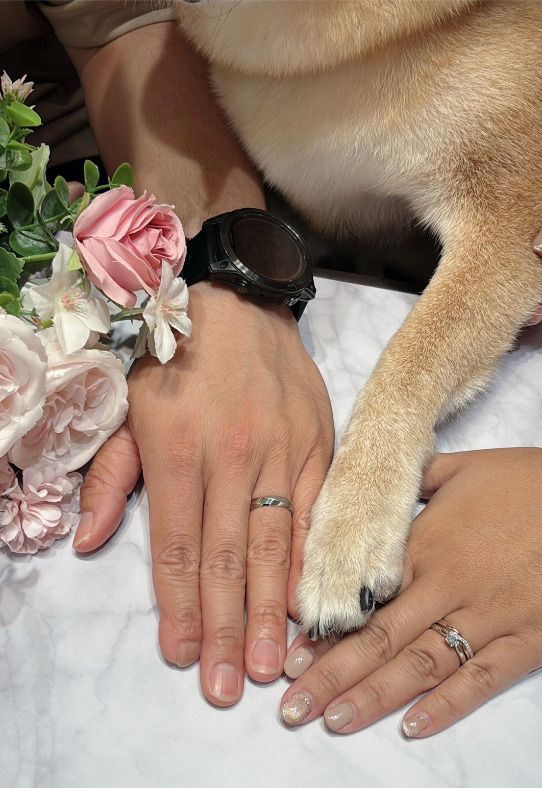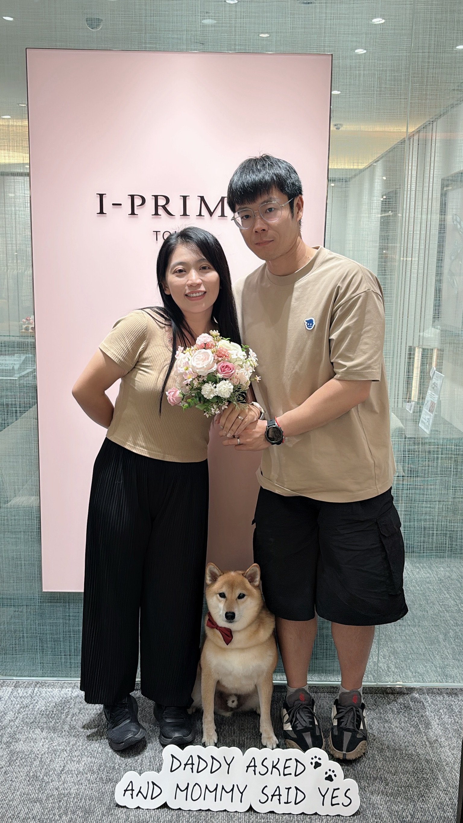 幾個月後,終於等到取貨通知。當那個小小的粉色盒子被輕輕打開,鑽石閃爍的光芒彷彿凝結了所有幸福與悸動。我們還帶上家中的小犬一同見證這份喜悅,門市人員更貼心地幫我們拍下合影,為這天留下溫暖而難忘的回憶。